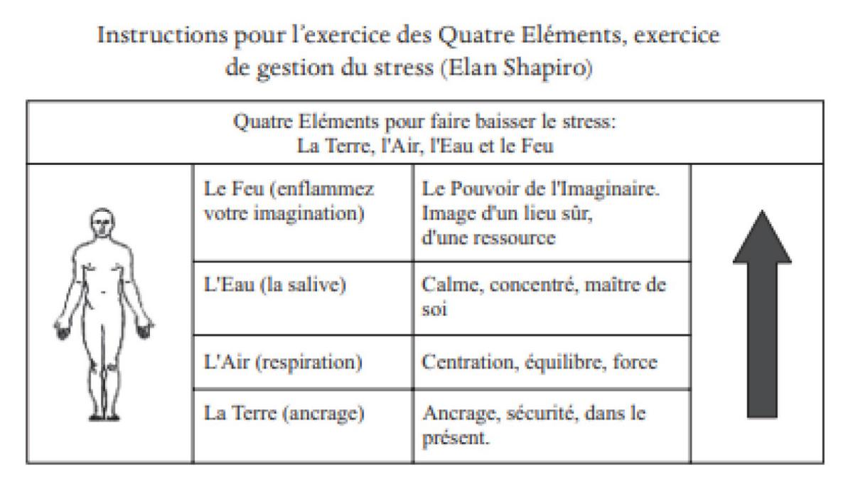 L’exercice des 4 éléments mis au point par Elan Shapiro, permet de maintenir cette zone de tolérance (Journal of EMDR Practice and Research, Volume 4, Number 2, 2010 Questions & Réponses Cliniques, P 28, ELAN SHAPIRO).